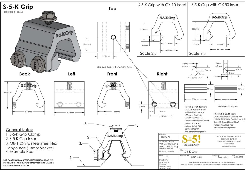Kẹp S5 dùng cho mái tôn kliplok được thiết kế có 2 loại là kliplok 700 và kliplok 406. Nó có chung 1 phần vỏ chỉ khác nhau phần ruột (miếng nêm bên hông là GX 10 insert hay GX 50 insert)